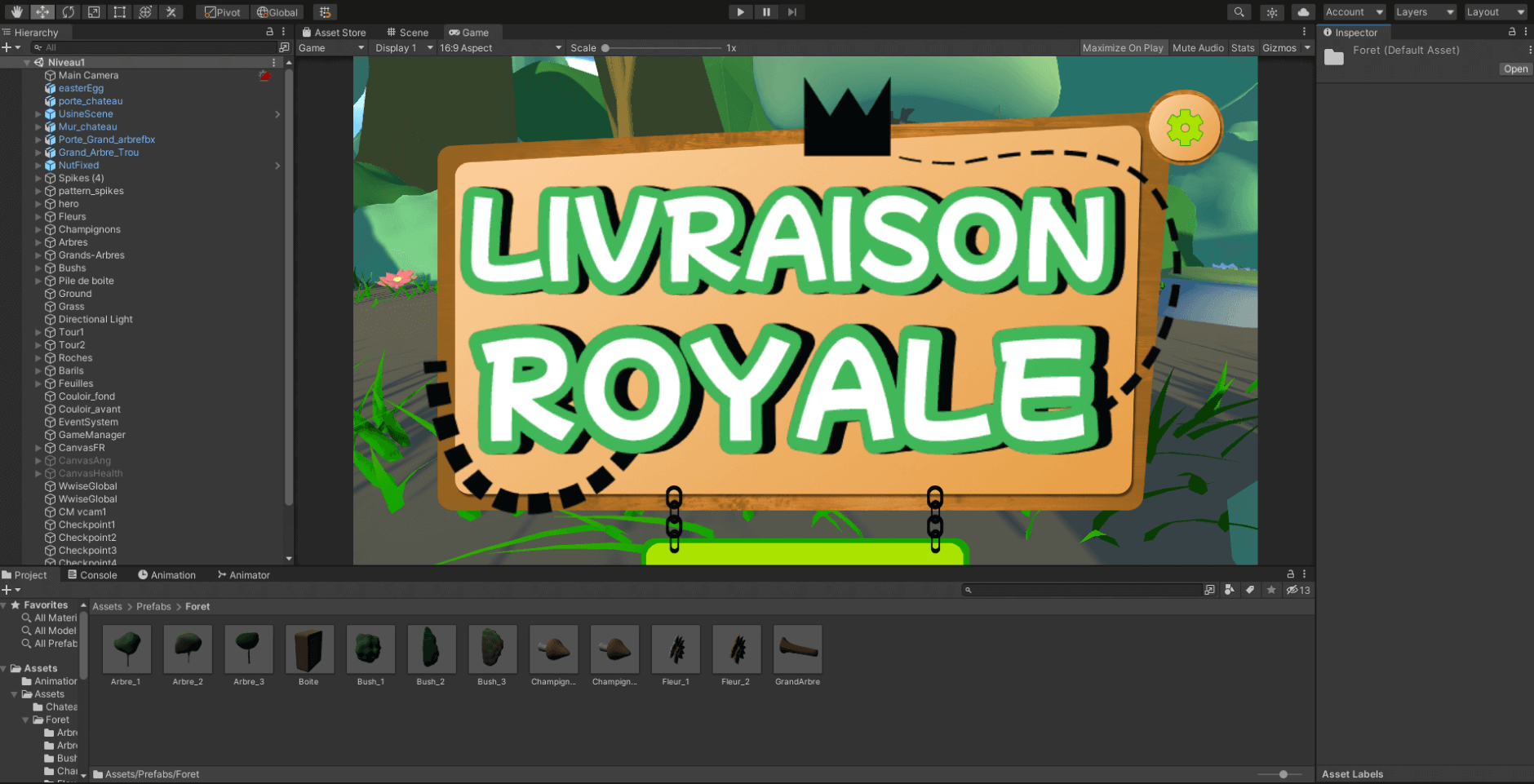 Livraison royale est un jeu de plateforme solo où le joueur doit livrer un colis au roi de la forêt. Développé en seulement deux jours lors de la compétition intercollégiale de jeux vidéo du Cégep de Valleyfield, ce projet m’a permis de relever un défi créatif intense.