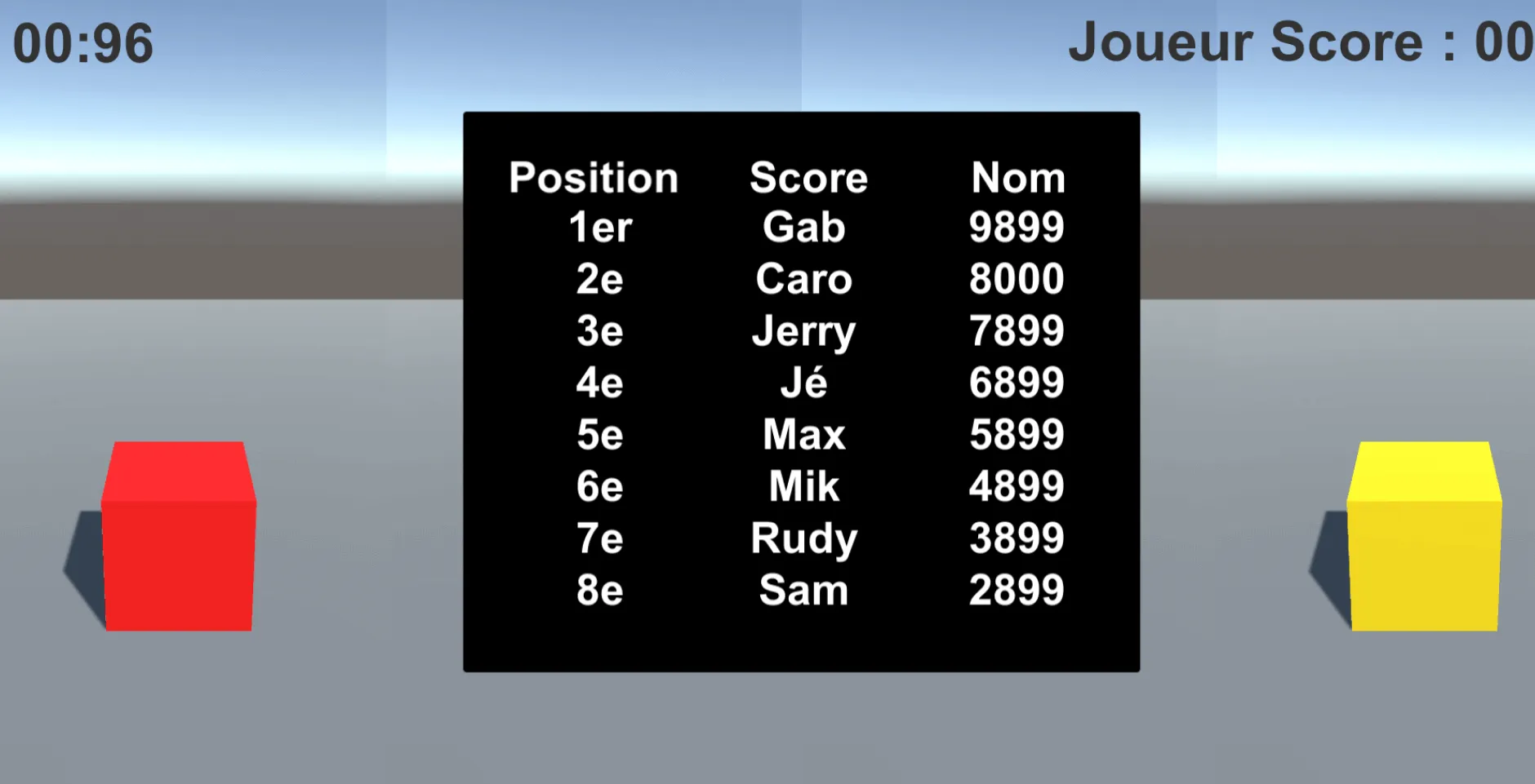 Je travaillais principalement sur la programmation en C#, notamment les menus, les systèmes de score et certains aspects du multijoueur. Au fil du projet, j’ai également contribué à l’intégration de contenu et au peaufinage général afin d’améliorer l’expérience de jeu.